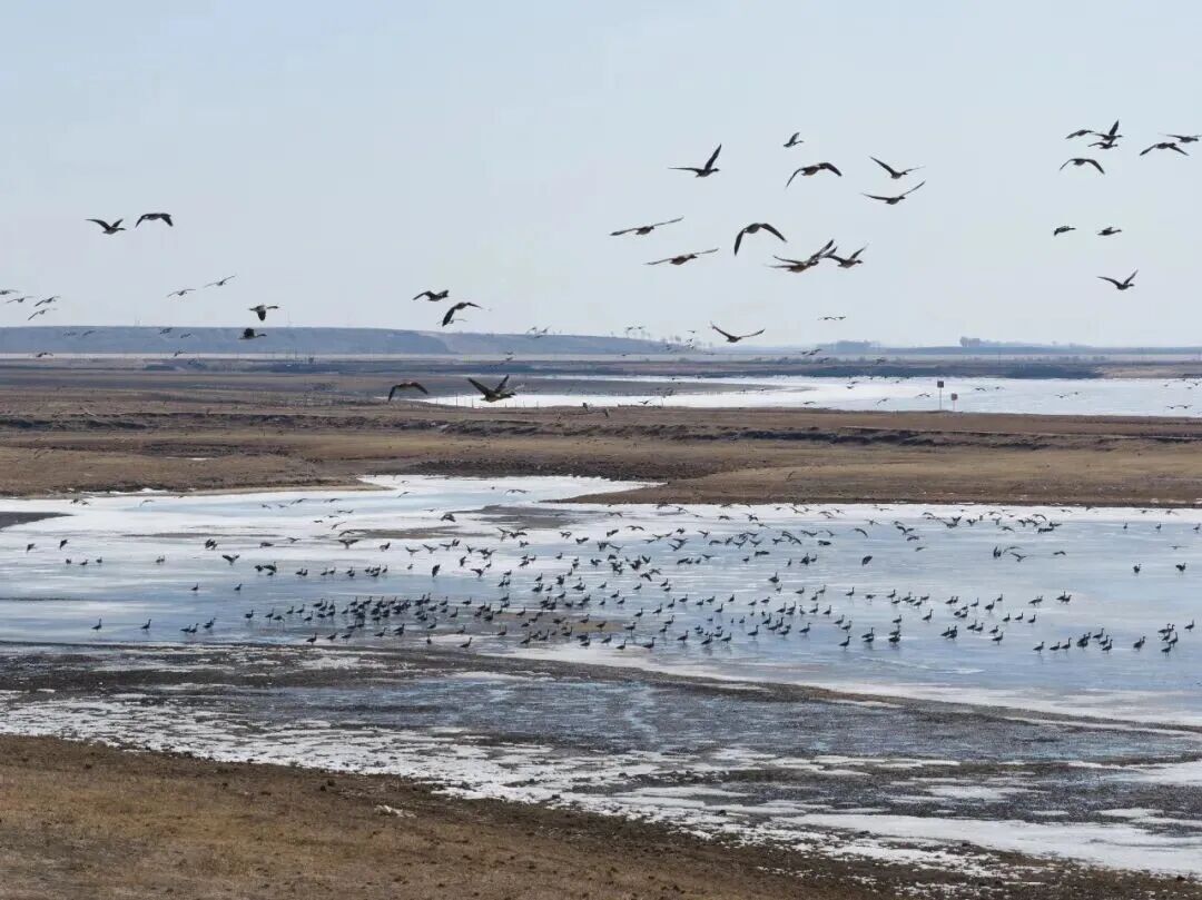 今年春季,气温较往年更为适宜,湿地解冻进度加快,食物充足,为北迁候鸟停歇补给创造了优越条件。目前,抵达的各类候鸟整体状态稳定,生动场景随处可见:20余只东方白鹳在传统栖息区域盘旋觅食、衔枝修补旧巢,精心为后续繁殖做足准备;300余只灰鹤集结停歇,或低空翱翔或漫步觅食,姿态悠然;3000余只大雁、野鸭在水面成群游弋、嬉戏追逐,不时掠过水面,泛起阵阵涟漪,一派生机盎然的春日盛景。这些候鸟正抓紧时间休整觅食,补充体能,为后续北上迁徙、繁衍后代筑牢基础。