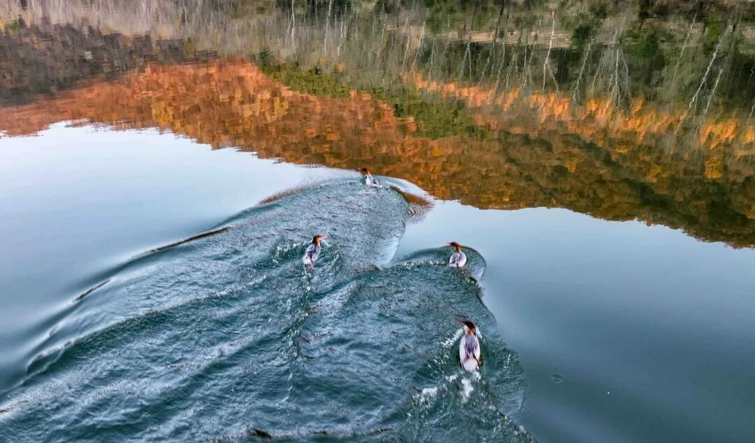 寒意初染长白山,秋阳仍暖碧水间。清澈的头道白河与抚松镇西江上,成群的中华秋沙鸭或扎入水底啄食肥鱼,或带领绒毛未褪的幼雏练习低空滑翔,灵动身影掠过斑斓秋林——这片“人与自然和谐共生”的土地,正成为第三纪冰川期遗存物种、国家一级保护动物中华秋沙鸭繁衍生息的乐园。
