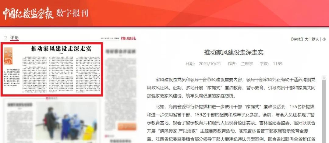 比如,海南省委举行新提拔和进一步使用干部“家庭式”廉政谈话会,135名新提拔和进一步使用省管干部、159名干部的配偶和成年子女参加。会前,与会人员还参观了警示教育基地,观看了警示教育片和服刑人员现身说法实录。吉林省纪委监委、省妇联联合开展“清风传家 严以治家”主题廉政教育活动,实现吉林省管干部家属警示教育全覆盖。江西省纪委监委结合部分领导干部夫妻违纪违法典型案例,联合省妇联向全省新任省管干部家属发出一封书信,要求领导干部管好亲属,提醒家属当好家庭监督员。一系列举措推动家风建设走深走实,促进家庭成员共守廉洁家门、共建廉洁家风。